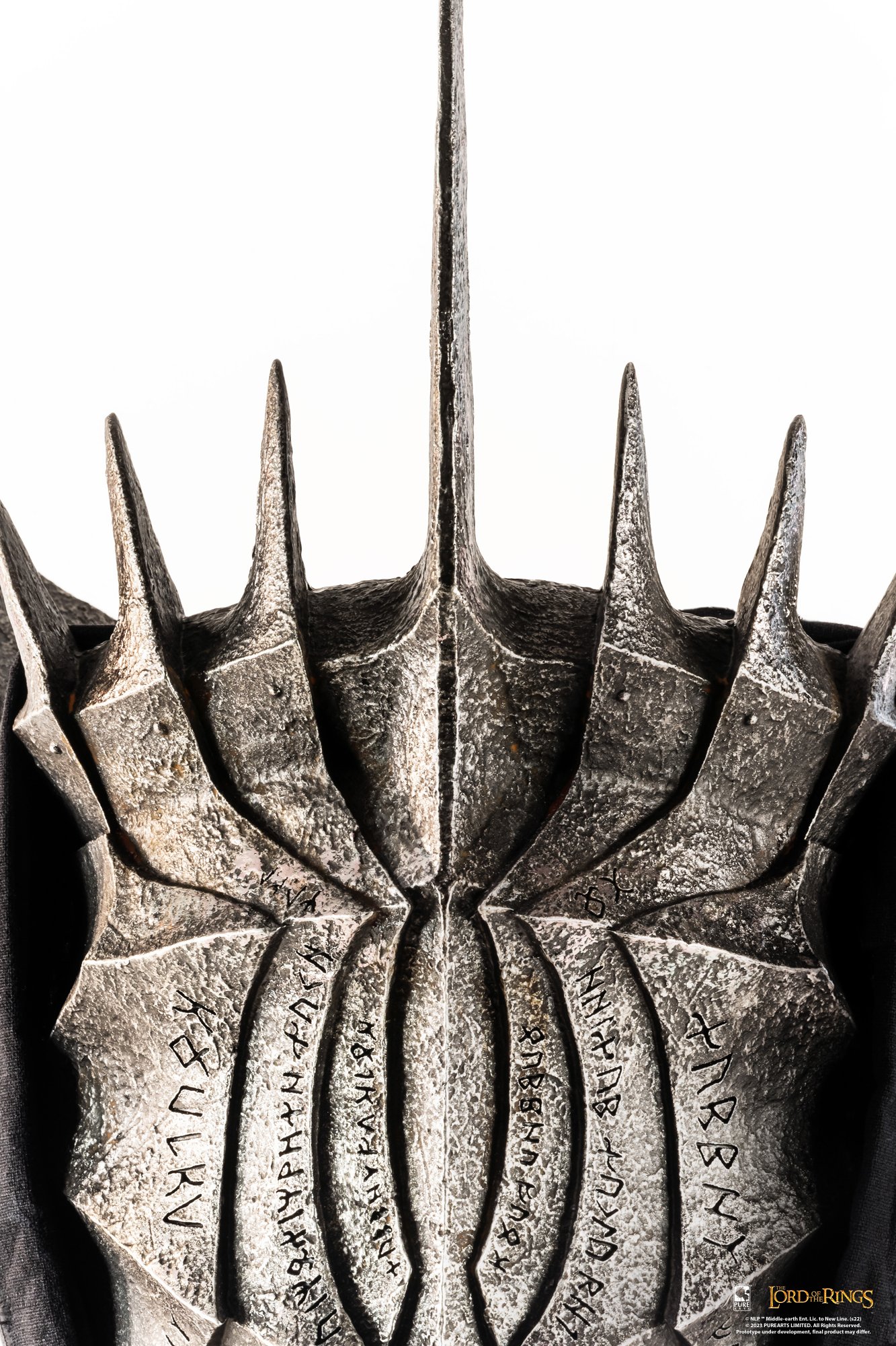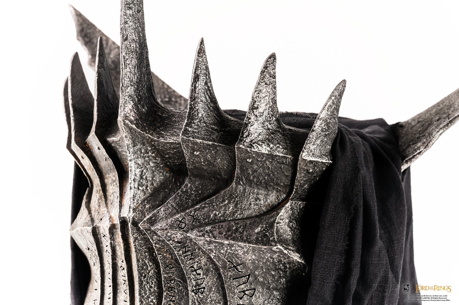 Sculpté avec un soin presque mystique, chaque détail du casque acéré, des plis de l’armure et du sourire déformé évoque la cruauté et la majesté du Mordor. L’éclairage LED intégré révèle des reflets métalliques dignes des flammes de Barad-dûr, donnant vie à ce visage maudit qui semble prêt à prononcer les ordres de son maître.